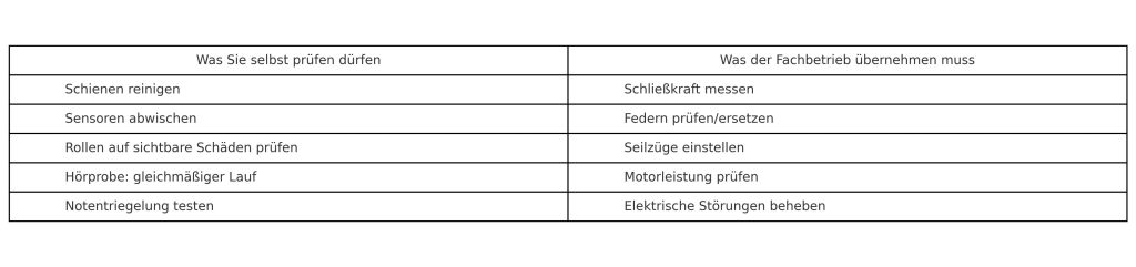 Nicht jede Kontrolle am Garagentor erfordert einen Fachbetrieb. Einige grundlegende Überprüfungen können Eigentümer selbst durchführen, um frühzeitig zu erkennen, ob das Tor sauber läuft oder ob sich erste Abnutzungsanzeichen zeigen. Here is why. Kleine Routinechecks verhindern, dass sich aus einfachen Verschmutzungen oder leichten Fehlstellungen größere Probleme entwickeln. Wichtig ist nur, die eigenen Grenzen zu kennen – denn Arbeiten an Federn, Seilzügen oder der Elektronik sind immer Aufgabe eines geschulten Technikers.